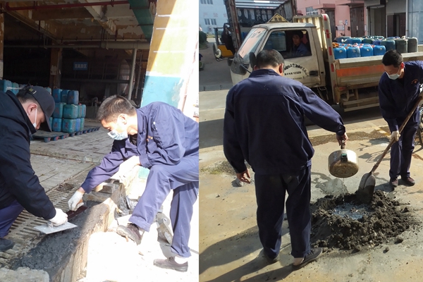 經(jīng)排查,鹽酸裝桶區(qū)圍堰因長時間受酸霧侵蝕,造成部分圍堰坍塌,磨損較為嚴(yán)重,存在一定安全隱患。發(fā)現(xiàn)問題后,“筑巢留雁”行動小組第一時間對現(xiàn)場破損圍堰進(jìn)行修補(bǔ),及時消除了隱患。