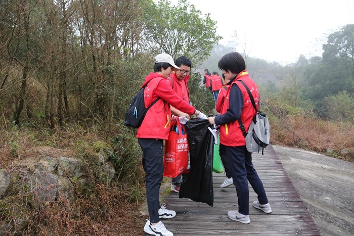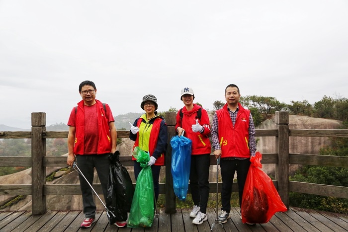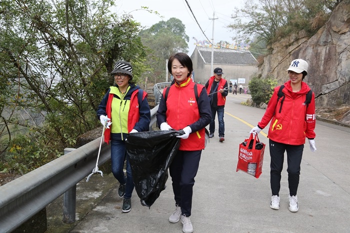 雨后的大羅山云霧繚繞,山影朦朧如仙境。15名黨員志愿者從大羅山石竹出發(fā),兩人一組,沿途撿拾垃圾,并根據(jù)垃圾種類正確投放至四色分類垃圾袋。志愿者們醒目的紅馬甲和垃圾分類撿拾行動(dòng),引得不少游客駐足觀看。志愿者們化身宣傳大使,現(xiàn)場(chǎng)普及垃圾分類知識(shí),引得游客紛紛點(diǎn)贊。