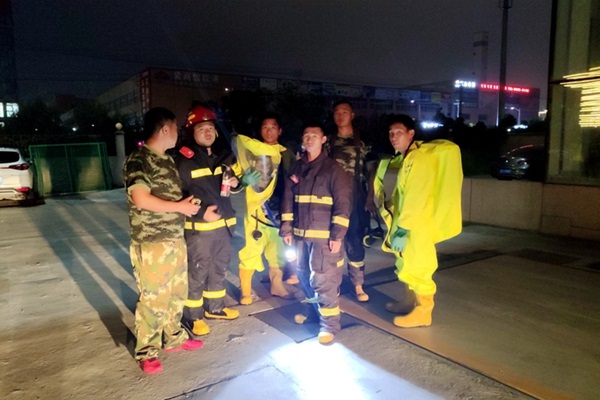 20時(shí)許,火勢已被撲滅。一樓機(jī)器設(shè)備中存有三氯氧磷屬高毒化學(xué)品,受火勢高溫影響,連接管密封可能會產(chǎn)生泄漏。指揮員下令由隊(duì)員陪同起火單位技術(shù)人員著防護(hù)服進(jìn)入現(xiàn)場拆卸設(shè)備中的三氯氧磷,統(tǒng)一運(yùn)送到金?;瘜W(xué)品市場劇毒品倉庫存放?,F(xiàn)場儲罐類危險(xiǎn)化學(xué)品無法夜間轉(zhuǎn)運(yùn),受經(jīng)開區(qū)應(yīng)急管理局委托由應(yīng)急救援隊(duì)安排隊(duì)員留守現(xiàn)場監(jiān)管。